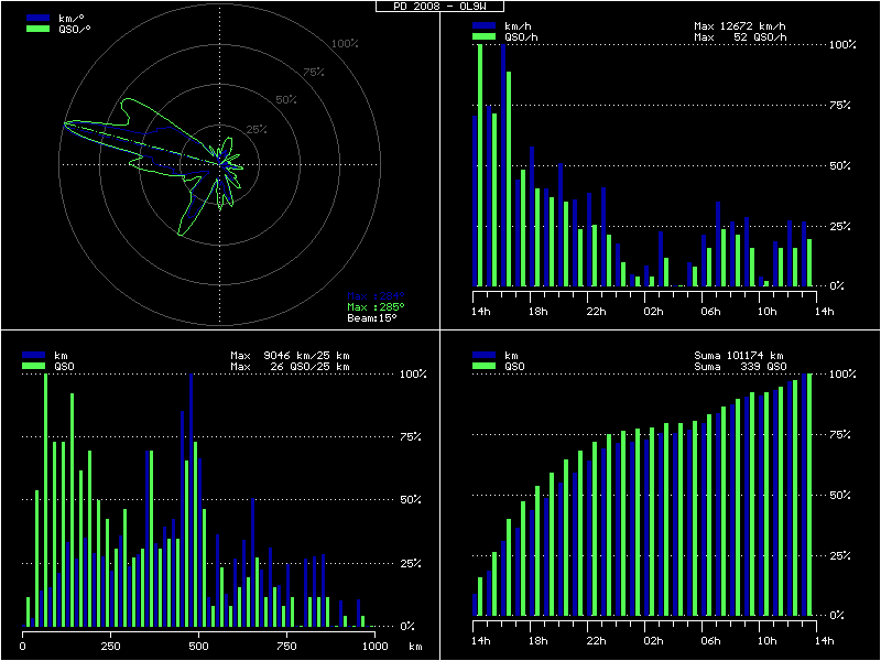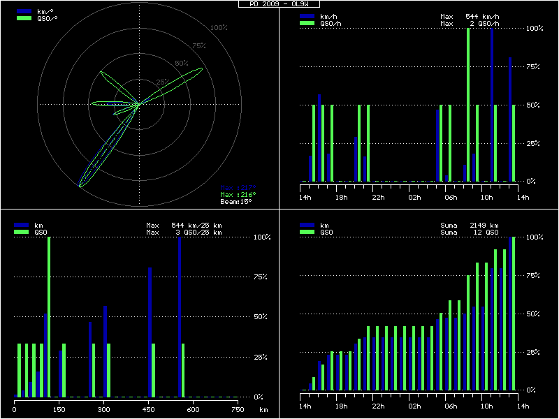 Dvojka se rozjela hodně dobře, Aleš v první hodině 102 QSO, ve druhé 73, takto impozantní nástup nepamatuji, a když i má třetí a čtvrtá hodina sice zaznamenala očekávaný pokles hodinového rate qso/hod, rostoucí průměr/qso dával tušit slušnému výsledku. Štafetu převzal jako obvykle Roman a ve 21.00 UTC 100t bodů, ve 22.00 UTC 400 qso a cca 116t bodů, to znamenalo prognózu kolem 800 qso a snad i 250t bodů, což by byl náš splněný cíl. V PD tradičně nízká aktivita stanic ze západu Evropy nám otevírala větší možnost věnovat se aktivitě na východ od nás a vyplatilo se. YO, UR, LY, LZ, EU, UA stanic v nevídaném počtu 42 stanic, dále pro nás rekordních 52 YU, naopak z S5, 9A, E7 a I jsme čekali trošičku víc. Vážné zamyšlení nad počtem anténních systémů ukázala neděle, kdy otočení fixní 4x6el. z I směru (220 st Az) na 245 přineslo za dopoledne 6 stanic HB, do té doby nic. Třešničkou na dortu pak skoro v závěru ODX F6HVK na SSB 1007km. U těch šťastnějších, kteří zachytili sobotní sporadik, nic moc, já vím... Skore se ve 14.00 UTC zastavilo na 275.000 bodů a 758 QSO, náš rekordní závod. Spolu s nulovými problémy s hardware, velmi slušným počasím, chlazenou plzní, toaletním papírem na WC 10m od židle, prostě závod jak se patří.